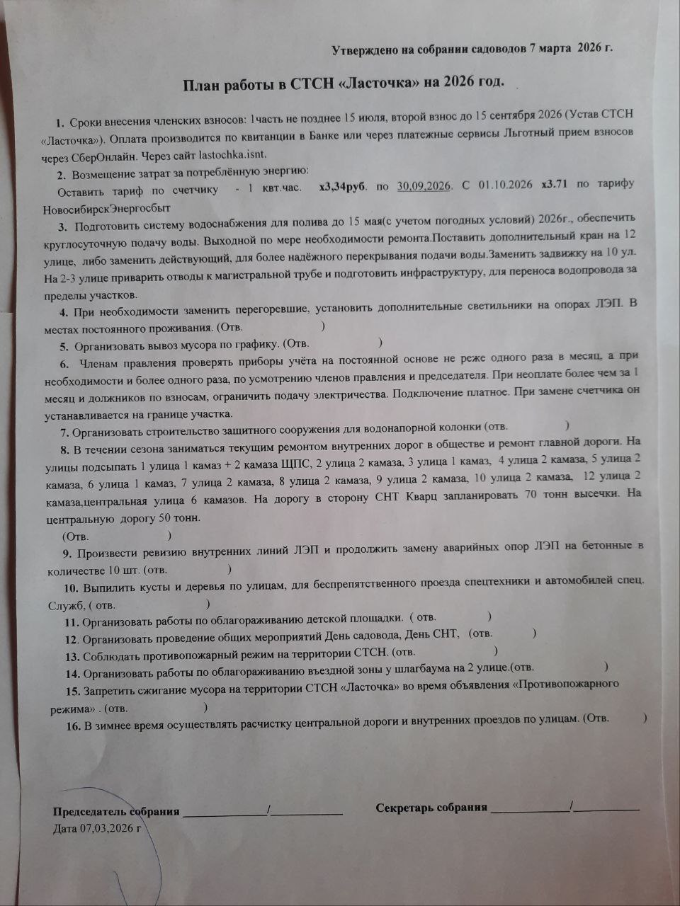- Утверждение старшим по 7 улице СТСН «Ласточка»
