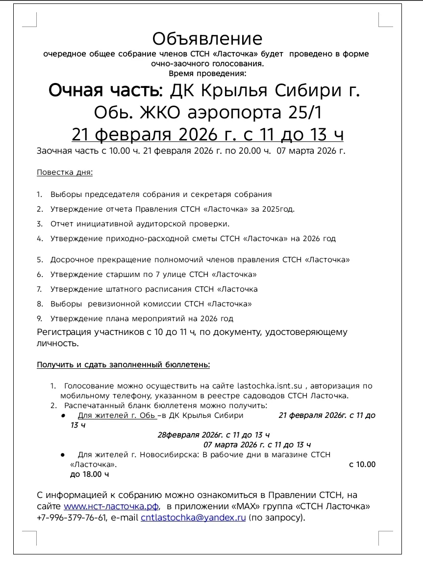 Объявление о проведении собрания СТСН ЛАСТОЧКА 21.02 2026г.